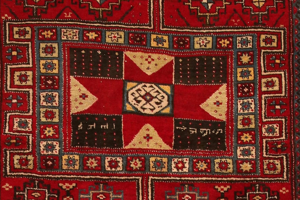 This striking 20th-century Karachoph rug showcases a classic Armenian-influenced composition, featuring a series of bold, stacked geometric medallions and traditional ram’s horn (kotchak) motifs rendered in a rich, naturally-dyed madder red and indigo palette.