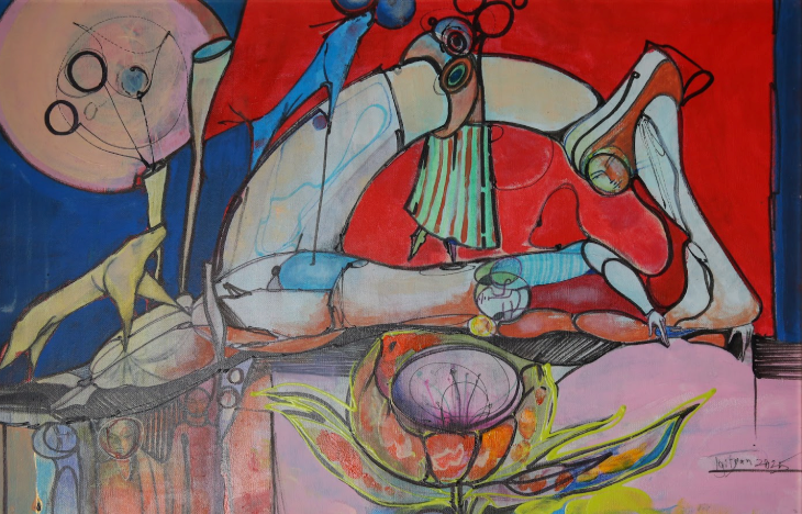 Through its linear and chromatic composition, this abstraction offers an entirely different perspective, inviting the viewer to see and move at the same time, to travel into another world while feeling a quiet urge to dive inward, toward one’s own inner depth.